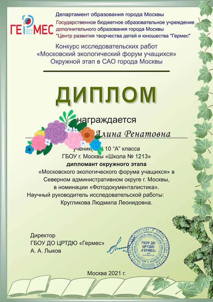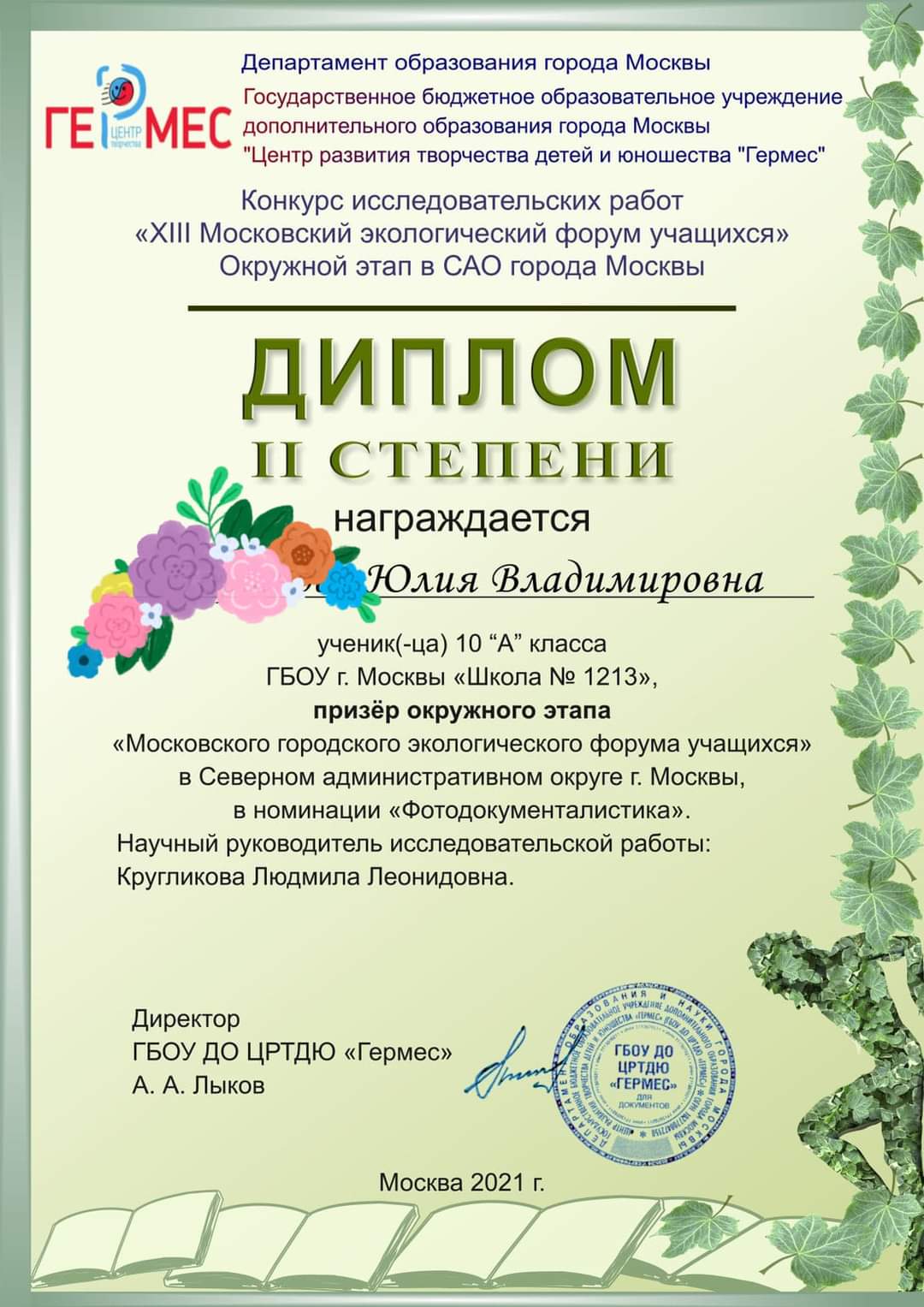 Поздравляем учащихся 10 А класса Алину и Юлия и руководителя Кругликову Людмилу Леонидовну, ставших дипломантом и призёром 2 степени в конкурсе исследовательских работ «Московский экологический форум учащихся»